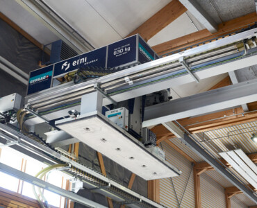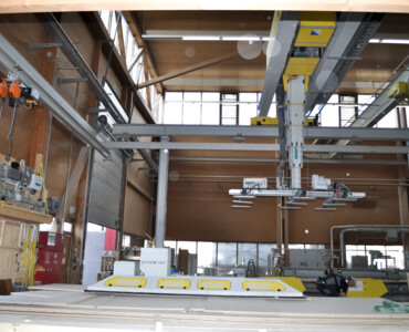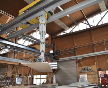 Karin ist das effiziente Multitalent rund um hochautomatisierte Produktionsstrassen im Holzelementbau. Der Stapelkran wird zum präzisen Einblasen von Dämmmaterial in Holzelemente verwendet. Mit der Wechselvorrichtung mit Vakuumaufnahme werden anschliessend Deckplatten im Handumdrehen auf dem Holzelement platziert. Der Karin-Kran ist die optimale Ergänzung für die Produktionsstrasse rund um einen Elementroboter.