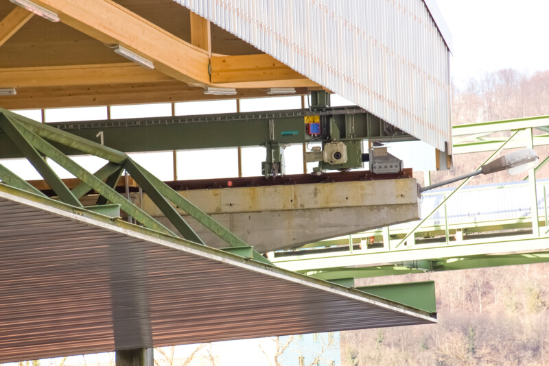 Jedes dieser Dächer hat zwei elektrische Antriebe und die Fahrwerke zum Verfahren eines Dachsegments sind auf bestehenden Kranschienen.