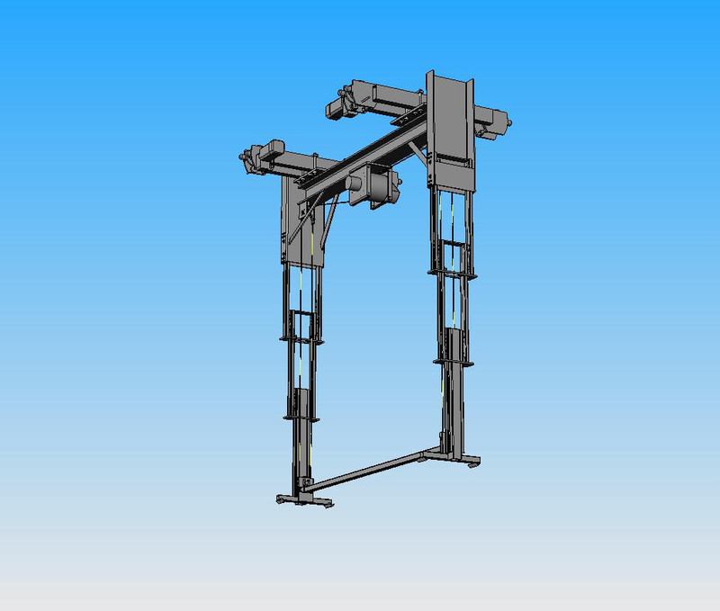 Bei automatischen Krananlagen müssen für kontrollierte Hub- und Fahrbewegungen die Schwingungen der Last unterbunden werden. Im vorliegenden Fall wurde das durch einen Teleskopmast erreicht. Oben in der Mitte ist ein Seilzug mit zwei Seilabgängen befestigt. Über Umlenkrollen erfolgt die Heben/Senken-Bewegung der Teleskopmasten.