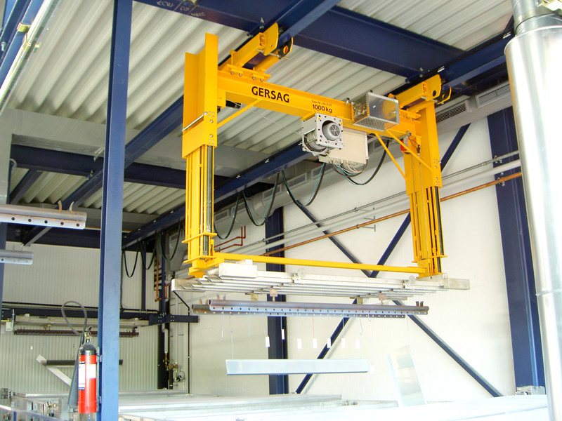 Der Umsetzerkran mit Triplex-Teleskopmasten führt das zu lackierende Material der Fensterproduktion durch die Vorbehandlungsbäder und Trockentruhe.