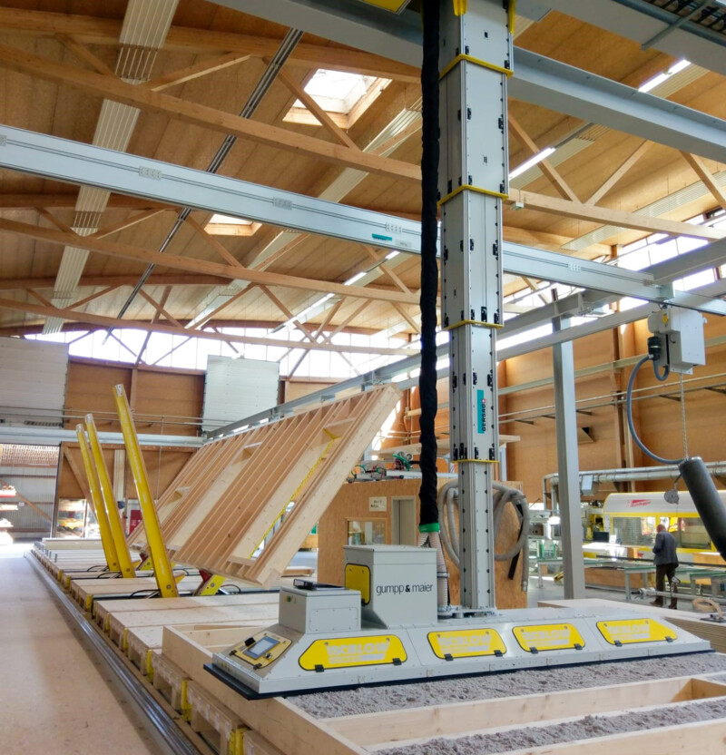 An ihrer neuen Fertigungslinie ist der Karin Stapelkran im Einsatz. Der Kran ist die passende Ergänzung zur Technowood Produktionsstrasse rund um den TW Milli-E Elementbauroboter. Während der Elementbauroboter Holzplatten, Brettschichtholz, ein oder mehrere Einzelstäbe effizient und präzise bearbeitet, sorgt Karin für die gesamte Logistik rund um die Anlage. Sie verfügt über eine Vakuumaufnahme und Vorrichtung für die Einblasplatte. So platziert sie das Material oder die Einblasplatte präzise mit Leichtigkeit auf der Produktionsstrasse.