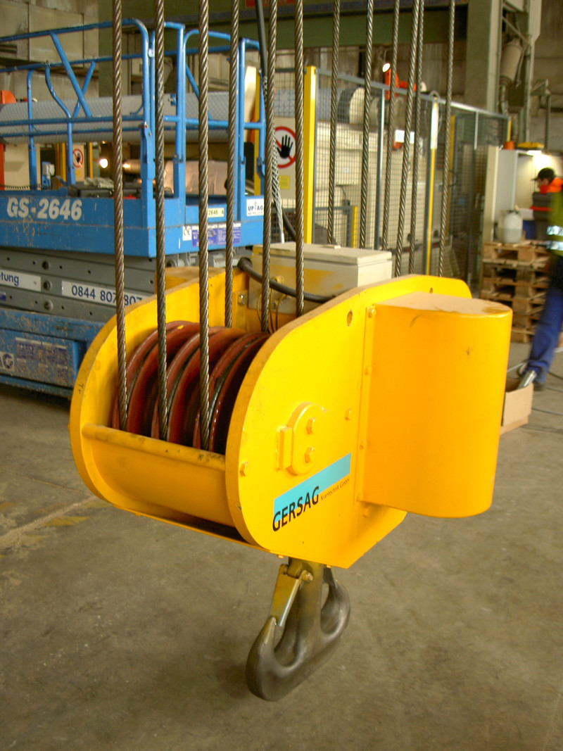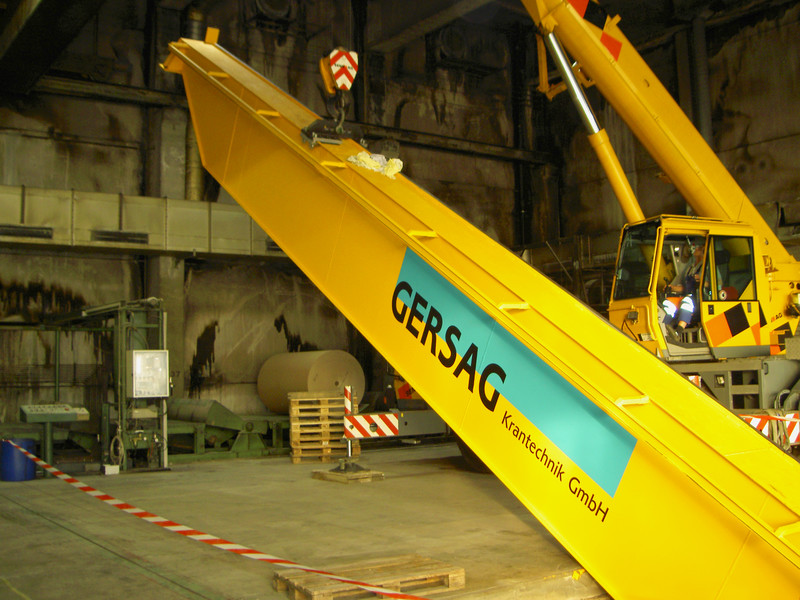 Die Kartonherstellung erfordert ein Drehen der 40t schweren Tambouren um 180º. Die GERSAG rüstete den neuen Kran mit einer elektrisch drehbaren Unterflasche aus. Alleine die drehbare Unterflasche mit Doppelhaken wiegt über 1 Tonne. Um dem Bediener das Drehen zu erleichtern, stoppt der Haken, durch Sensoren gesteuert, alle 90º Schritte.