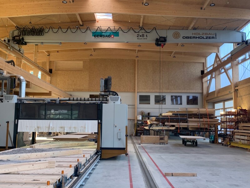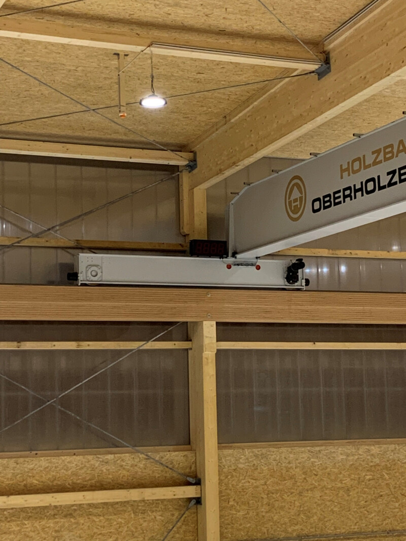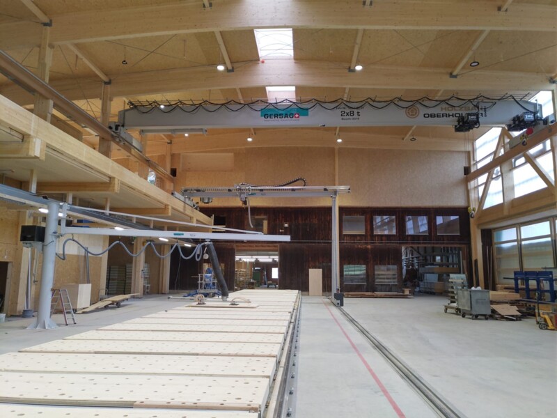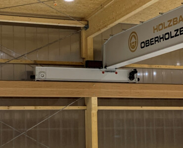 Für die Oberholzer GmbH in Eschenbach realisierte Gersag Krantechnik AG eine hocheffiziente Lösung für die innerbetriebliche Logistik. Die ganzen Anlagen sind verteilt auf drei Ebenen. Die Kranlösungen unterstützen standardisierte Abläufe rund um die Produktionsstrasse und den Elementbauroboter. Dabei wird höchste Flexibilität im Holzsystembau ermöglicht. Auf der oberen Ebene sorgt ein Einträgerbrückenkran mit zwei Katzen für den Hallentransport. In der mittleren Ebene kommt ein Halbportalkran mit Einblasplatte zum Einsatz, der die Holzbauelemente mit Dämmmaterial befüllt. Die untere Ebene wird durch Schlauchheber an Säulenschwenkkranen ergänzt, die punktuelle Platzierungen auf der Fertigungslinie erlauben. Dank dieser durchdachten Krantechnik kann die Oberholzer GmbH ihre Sortimentsbreite effizient abdecken – ein klarer Wettbewerbsvorteil!